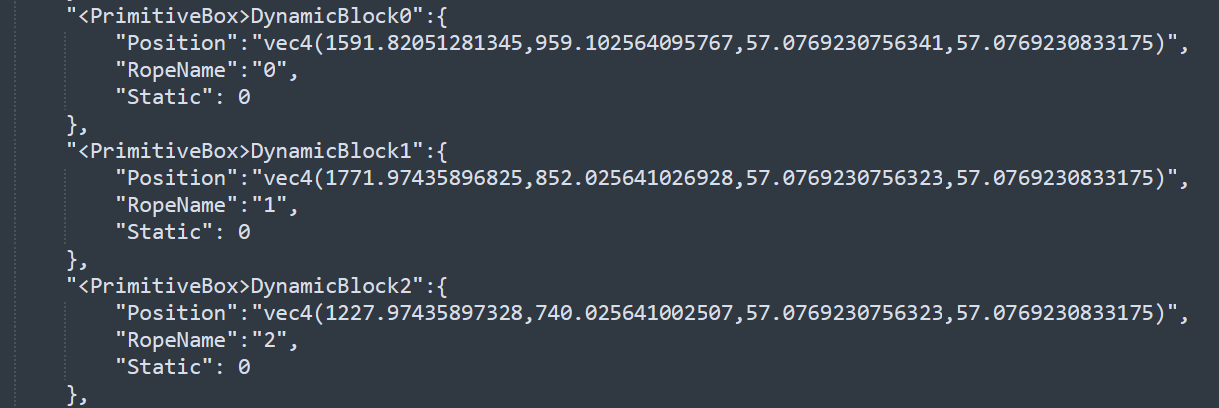 Level content in json—blocks are defined and “RopeName“ attribute is used to bind the block to a rope endpoint.