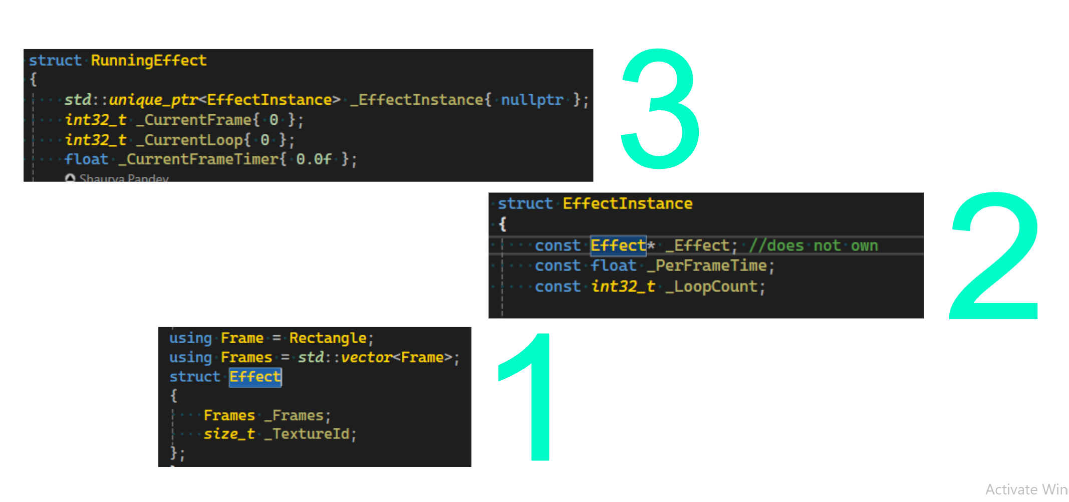 RunningEffect – Tracks runtime-specific details, including the current frame, loop iteration, elapsed time for the current frame, and when to transition to the next frame.